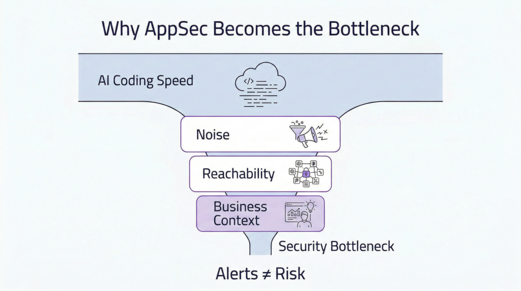 • The Noise Floor is Rising: Traditional tools identify “findings’, not actual risk. They generate thousands of severity labels without context, leading to “alert fatigue” and a total breakdown of trust between security and engineering teams.